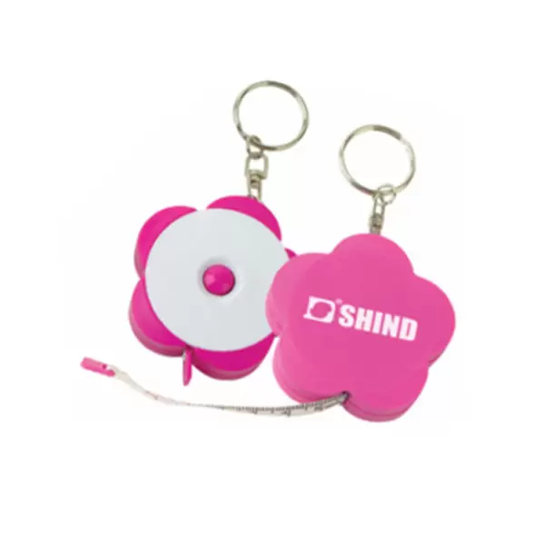 Flower shaped tape measure. 5ft long with inch and metric units imprinted. Pushing white button allows tape to retract . Tape blade is PVC fabric . Colors blue , Pink , green , red, purple .Size: 2 1/4″” x 2 1/4″” x 5/8″” Price includes 1 color 1 location imprint and air freight in US.