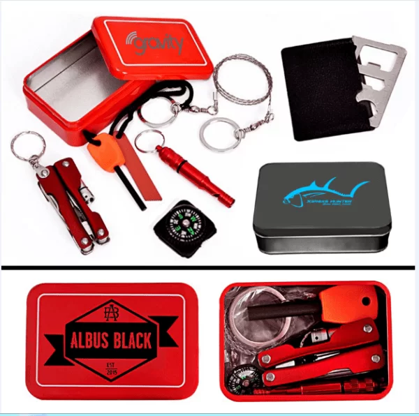 Complete Custom Outdoor Survival kit in Tin box. Available in Standard Red SOS or Customize the Stainless steel silver tin with your imprint. Survival Kit Includes: Firestarter, Emergency Aluminum Whistle, Mini compass, Multi-use tool with a pocket knife and Flashlight, Multi-functional metal lifesaving card, and a Hand wire saw. Useful items inside this compact tin box with a lid. Lightweight, durable, moisture-proof, compact size. Great for hiking, camping, hunting, outdoors, emergency, marine, and auto. SOS red tin is standard.  Optional : Silver tin with your logo or graphic. Price Includes 1-color imprint on the tin box and survival tools inside. For Qtys over 1000 customize the content to your requirements. Price includes shipping by air DHL. Quick production and Delivery.