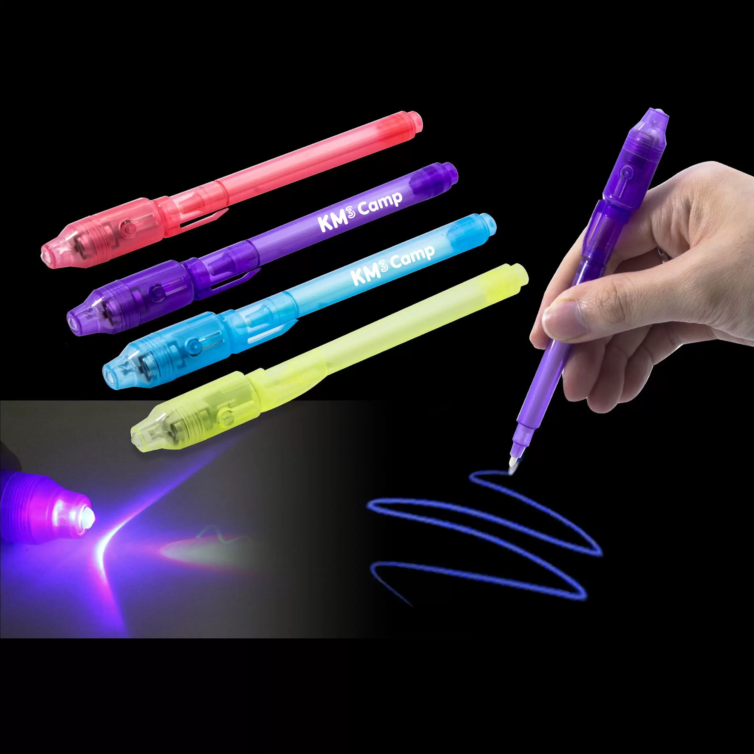 UV spy pens with led light. Write with the invisible ink and then watch it appear with the LED light. Fun for all ages. Colors red, yellow, blue, purple, pink, green and black. Imprint size is 0.86″ x 0.25″. Price Includes 1-color imprint on barrel. Price includes Shipping by air DHL. Quick production and Air Delivery Door to Door.