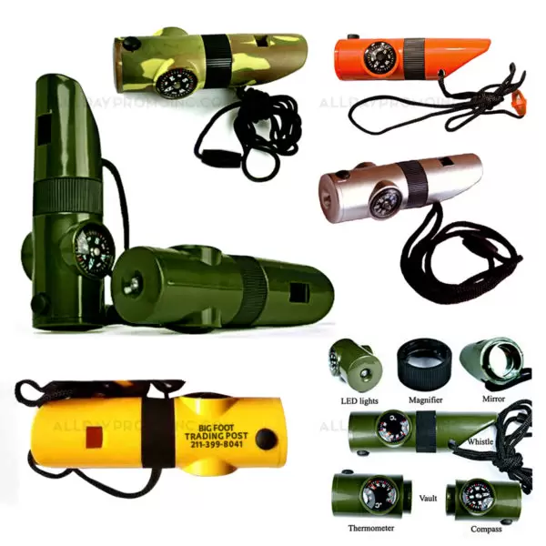 Description:This 7 in 1 Rescue Survival Whistle has: LED flashlight, 5x magnifier, thermometer, Signaling mirror reflector, compass, storage tube compartment, whistle with 17″ neck lanyard. All are a must for outdoor hiking, camping, fishing, and travel. Powered by 2 CR2016 batteries (included). Great item for Camping, Hiking, Hunting, fishing, Exploration, and safety programs. Size: 3 7/8″ x 1 1/16″. Colors: Camo. Green, and Safety Orange, Yellow, Red. Min. quantity for logo imprint is 500pcs. Price includes Air freight shipping door to door. Ocean shipping is available on qty’s above 25,000 contact.